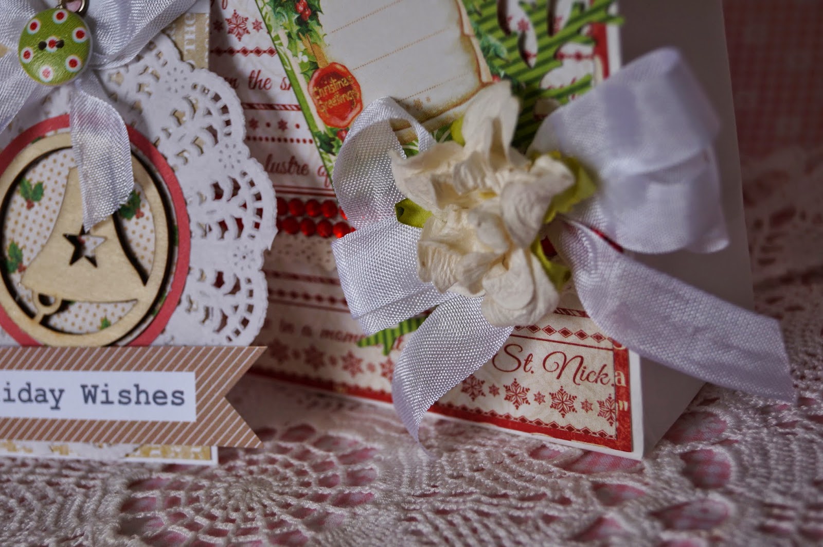 There's not that much to really tell about these I have used a selection of papers from the Graphic 45 Twas The Night Before Christmas paper pad, which I have co-ordinated with some of the tags from the ..... sheet; some seam binding in Christmas colours; mulberry paper flowers from my stash and some lace from a previous creative team kit. I have also created some matching tags from the 3 remain tags in the kit. I have embellished them with the wooden icons; buttons and sentiment banners.
